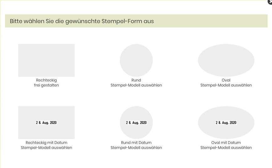 Nutzen Sie unseren benutzerfreundlichen Stempeldesigner, um Ihre Ideen in wenigen Schritten umzusetzen. Im ersten Schritt können Sie die Grundform Ihres Stempels auswählen. Im Anschluss schlagen wir Ihnen unterschiedliche Stempel passend zu Ihrer Auswahl vor, die Sie weiter personalisieren können.